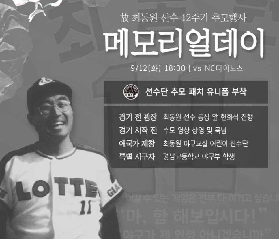 롯데 자이언츠는 12일 사직구장 홈구장에서 열리는 NC 다이노스와 경기에서 최동원 선수의 메모리얼데이 행사를 진행했습니다. 경기 시작 전 전광판을 통해 추모 영상을 상영한 후 선수단과 입장 관중이 함께 묵념의 시간을 가졌습니다. 최동원 야구교실 어린이 선수단의 애국가 제창을 통해 메모리얼데이를 기념하고 최동원 선수 출신고인 경남고의 야구부 학생이 특별 시구를 맡았습니다.