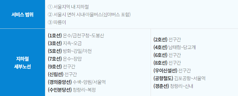 - 이용범위 : 서울지역 지하철, 서울시 면허 시내 마을버스, 따릉이