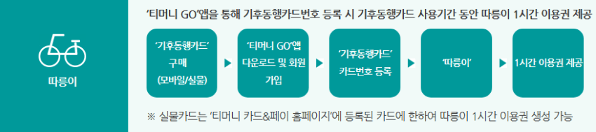 따릉이 이용 시 티머니 GO앱을 이용하여 기후동행카드번호를 등록하시면 따릉이 1시간 이용권을 제공받습니다.