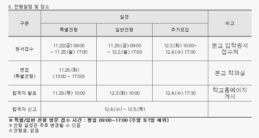 * 아래 링크를 통해 특별전형, 선발방법, 학과별 실기평가 및 배점 등 자세한 정보를 확인할 수 있습니다.