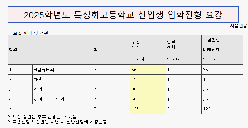 2025년도 서울인공지능고등학교 신입생 모집학과, 정원입니다.