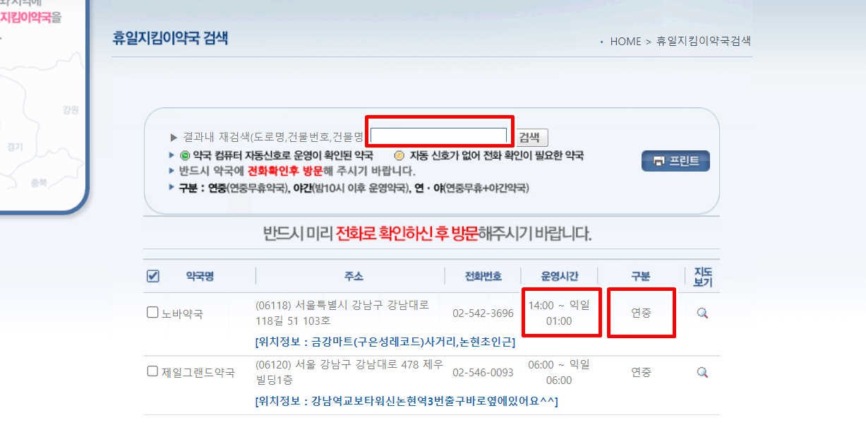 그러면 아래와 같이 휴일에도 운영하는 운영하는 약국 리스트가 검색됩니다. 좀 더 구체적으로 집주변의 운영하는 약국 검색을 원하시면 도로명을 입력하시고 재검색을 하시면 됩니다. 운영시간과 구분을 확인하시고 약국을 방문하시기 전에는 반드시 미리 전화로 운영여부를 확인하시고 방문하시기 바랍니다.