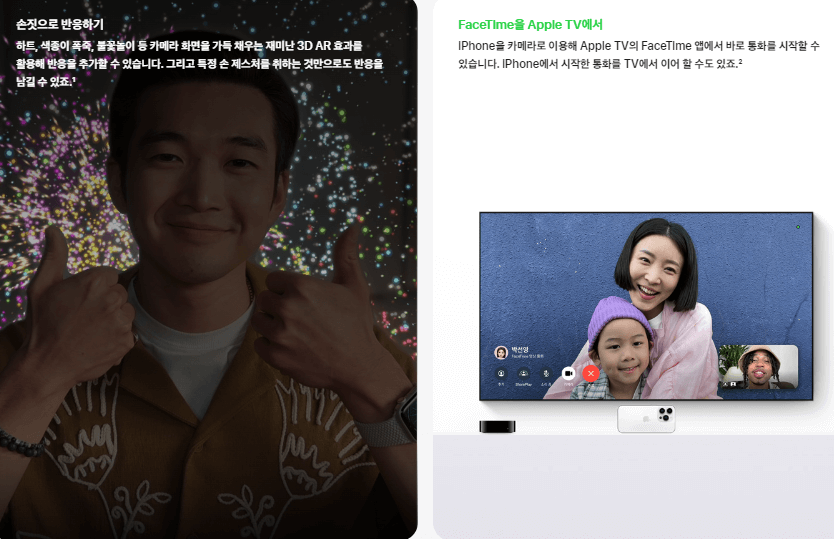 - 아이폰을 카메라로 이용해 Apple TV의 페이스 타임 앱에서 바로 통화를 시작할 수 있으며 아이폰에서 시작한 통화를 TV에서 이어서 할 수 있습니다.