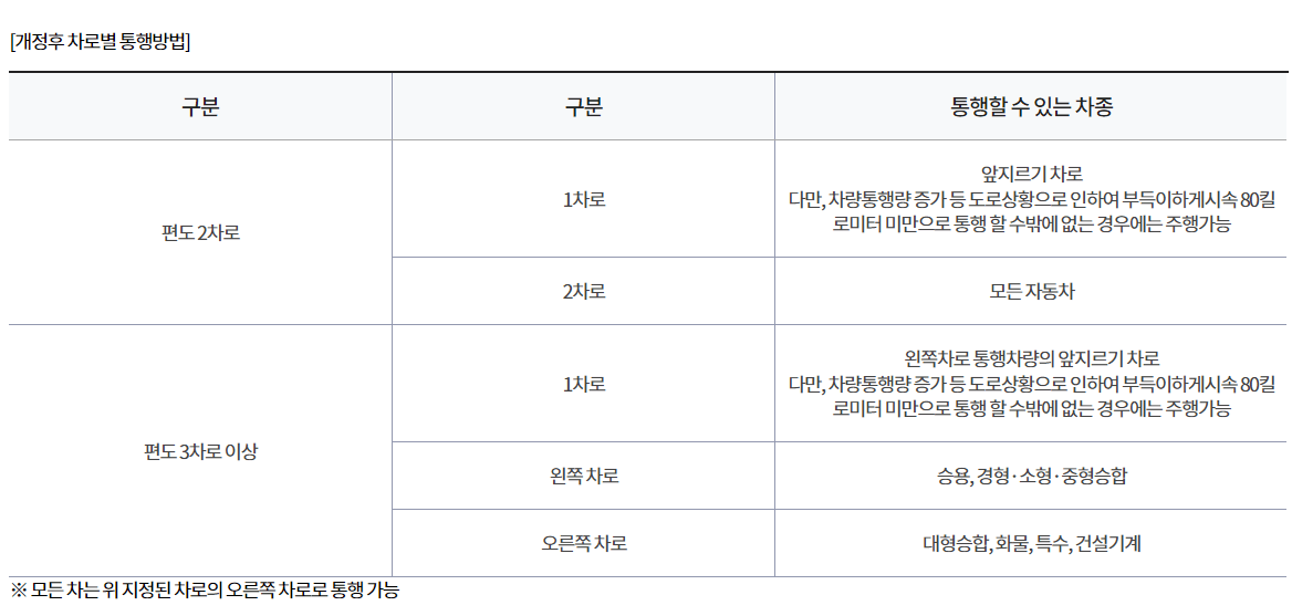 지정차로제란? 도로이용의 효율성을 높이고, 교통안전을 확보하기 위해 차량의 제원과 성능에 따라 차로별 통행 가능 차종을 지정한 제도를 말합니다. 지정차로 개정이유 현재의 지정차로제는